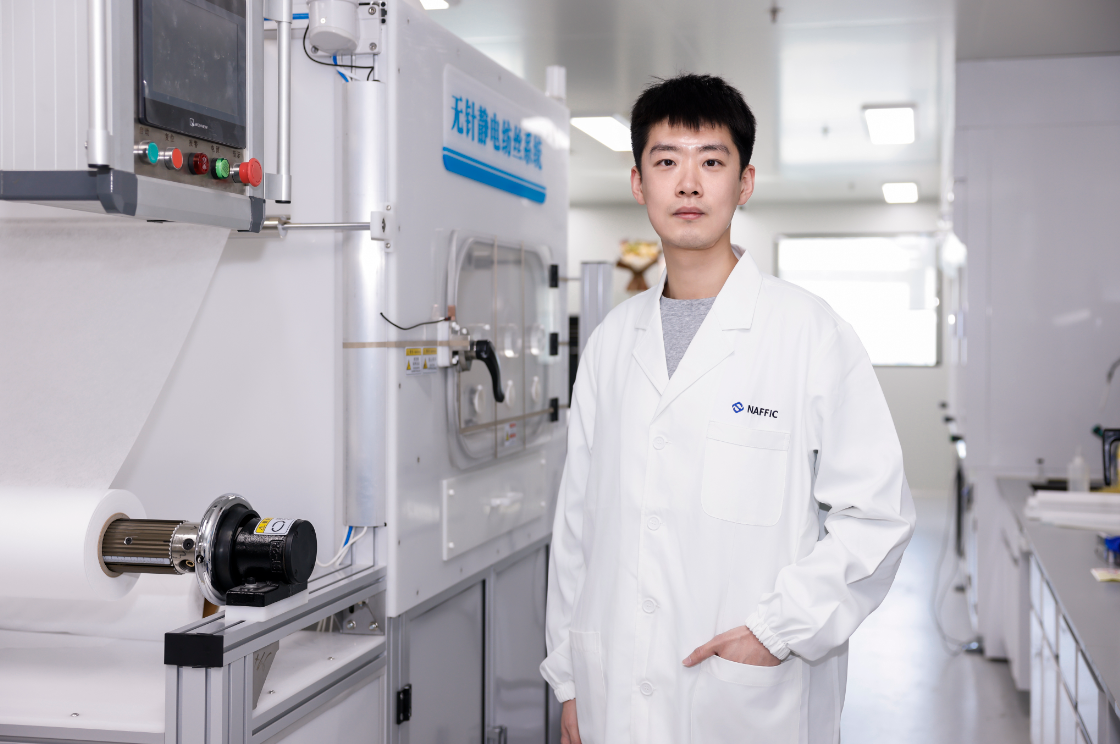 安静的实验室里,只有纺丝设备运行发出的“嘶嘶”声。一个瘦瘦高高的男生,穿着白色科研服,双眼紧紧盯着面前纺丝设备的出丝情况。“终于成功了!”王恒宇看着出丝端口完美的出丝情况,和同伴们一起欢呼起来。