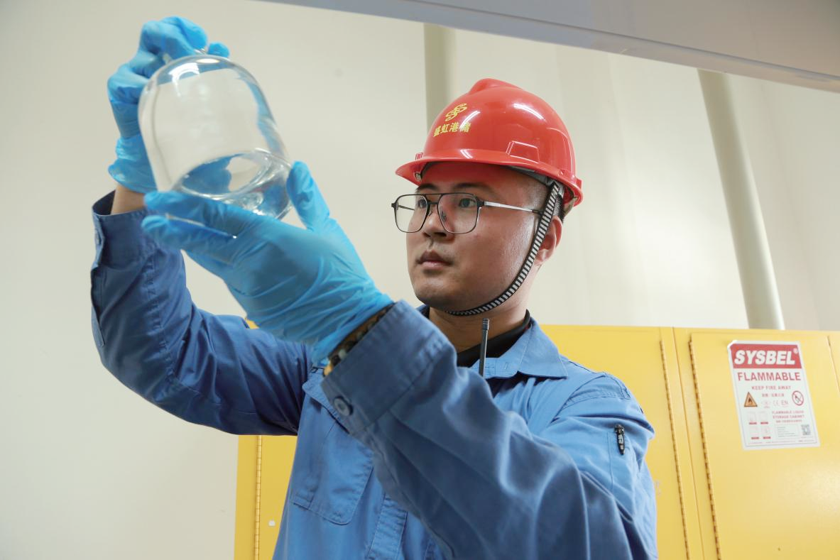 七月盛夏,碧海流云。在盛虹炼化港储码头不远处的储油罐区,一个中等身材、剑眉星目的小伙正站在20多米高的原油储罐顶部,手拿量油尺,对罐内存油高度进行精准测量。只见他熟练地将系有铜锤的量油尺插入检尺孔,摇轮飞转,下尺、收尺、精准读数,动作行云流水,在场人无不挑大拇指。